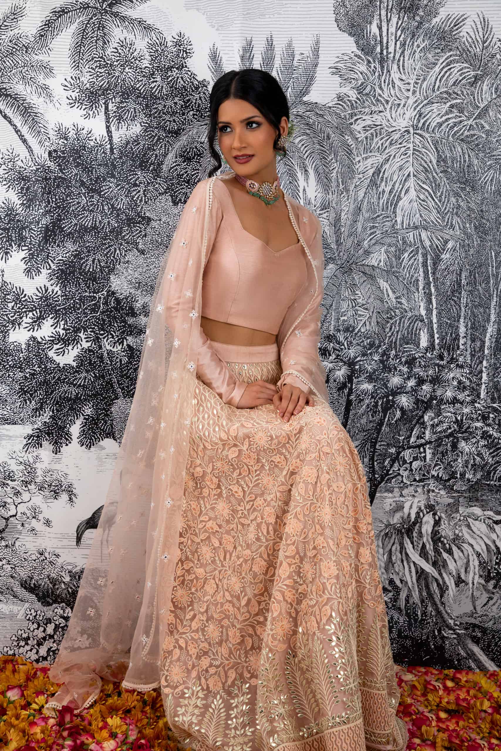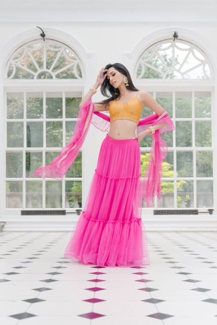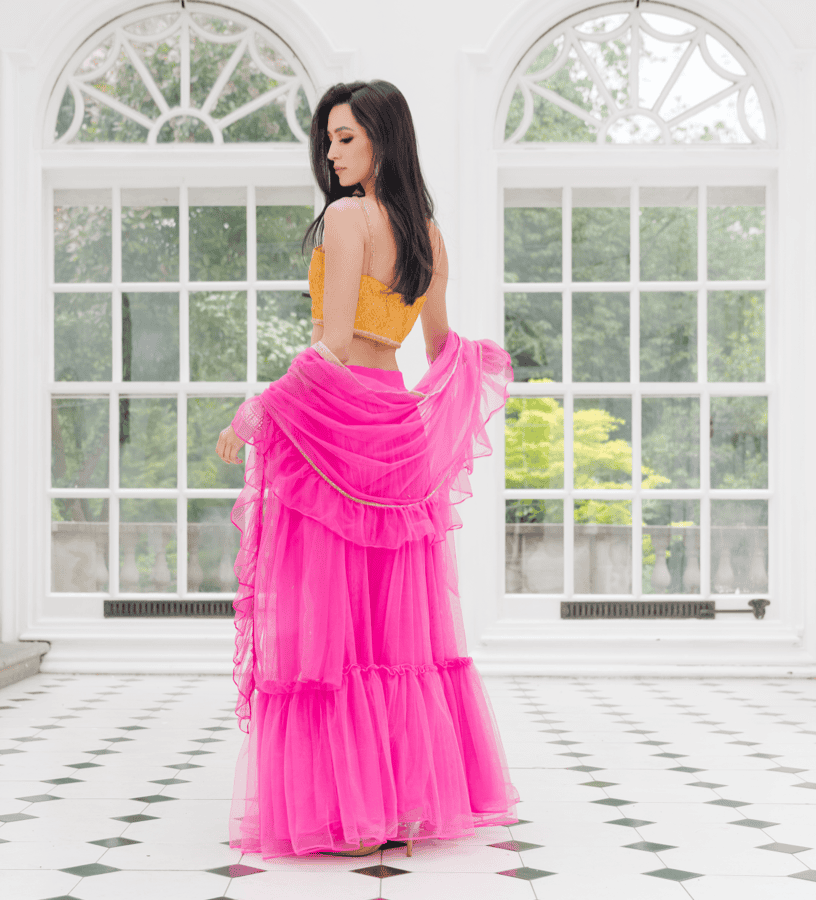 This versatile masterpiece is a testament to refined sophistication, perfect for every occasion that calls for an elevated sense of style. Whether it’s a chic daytime event, a glamouras evening affair, or a coveted bridesmaid ensemble, this outfit effortlessly captures attention. Mustard corded lace top with sparkly cutdana details, paired with a tulle skirt and tulle duputta.